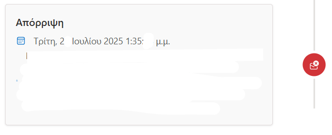 • Η κατάσταση  Απόρριψη  υποδεικνύει την ημέρα και την ώρα που η αναθέτουσα αρχή απέρριψε το παραστατικό και η αναθέτουσα μπορεί να προσθέσει σαν σχόλιο τον λόγο απόρριψής .