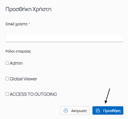 4) Στη νέα οθόνη, συμπληρώστε το email του χρήστη που επιθυμείτε να προσθέσετε στην εταιρεία που κάνατε log in.