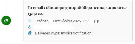 - Η κατάσταση Αποστόλη ενημερωτικού μηνύματος υποδεικνύει την ημέρα και την ώρα που στάλθηκε ενημερωτικό SMS/Viber/email με το link του παραστατικού.