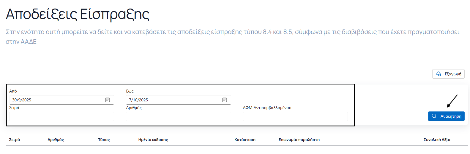Ναι, μέσω του Portal παρέχεται η δυνατότητα εντοπισμού και ανάκτησης αποδείξεων POS (εισπράξεων και επιστροφών). Ακολουθήστε τα παρακάτω βήματα για να αναζητήσετε τις σχετικές πληροφορίες: